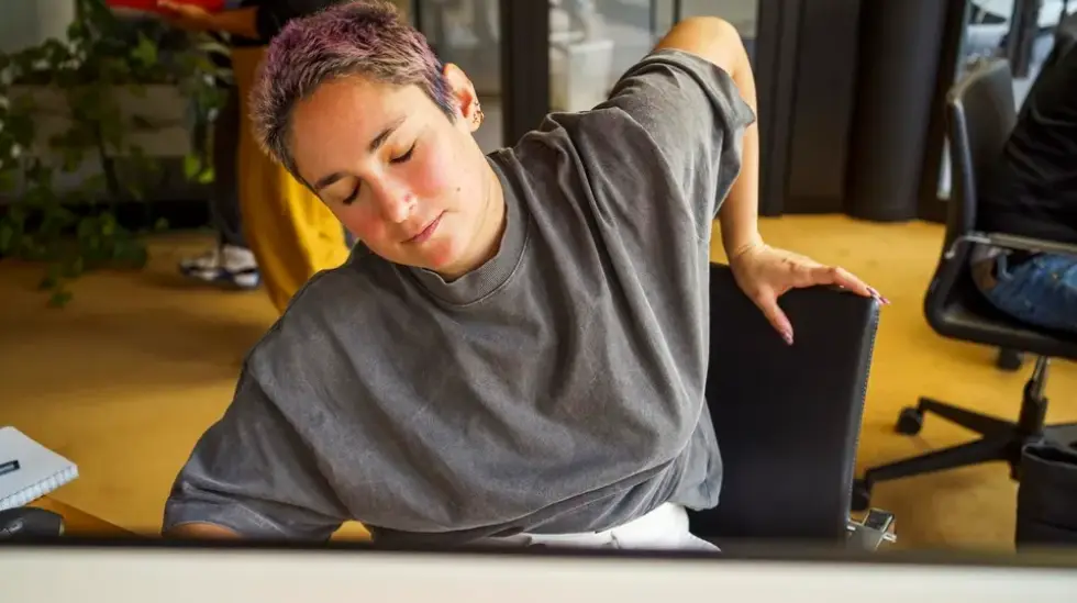 Podés recargar energías haciendo yoga en tu escritorio, en la misma silla en la que estés, siempre que tenga respaldo. Apoyá la mano izquierda sobre la rodilla derecha y llevá el brazo derecho al respaldo de la silla. Estirá suave, con los ojos abiertos o cerrados, y prestá atención al estiramiento y a lo que pasa en tu interior. Después de 60 segundos, volvés al centro.