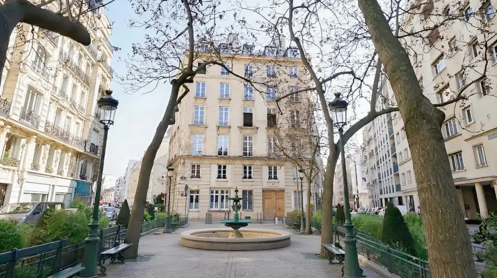 Construido en 1830, el edificio ocupa una ubicación privilegiada en la plaza, con vistas abiertas y sin vecinos con vista directa al interior. Su emplazamiento en el Barrio Latino parece salido de una lista con los rincones más emblemáticos de la ciudad: la Sorbona, el Jardín de Luxemburgo, el Panteón, la Plaza Saint-Michel y Shakespeare and Company. Todo compone una postal de París digna de una película.